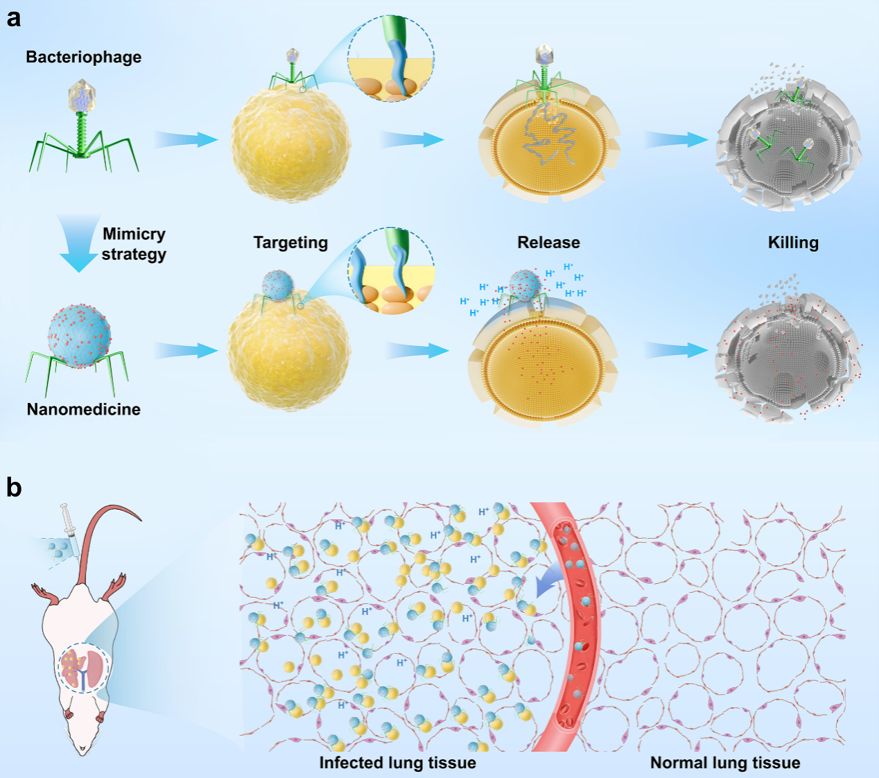受噬菌体递送其遗传物质至宿主菌的精准性启发,该研究运用噬菌体受体结合蛋白(Receptor-binding proteins, RBPs)作为基于动态共价化学策略负载肽类抗生素纳米载体的靶向模块,成功构建了仿噬菌体递送系统。该递送系统成功将肽类抗生素乳酸链球菌素精准递送至了耐甲氧西林金黄色葡萄球菌(Methicillin-resistantStaphylococcus aureus, MRSA)的感染部位,显著提高了其治疗效果。更重要的是,通过该策略显著降低了乳酸链球菌素高浓度静脉注射的急性毒性,使其成为可静脉注射的候选抗菌药物。该研究为肽类抗生素的减毒增效提供了全新的策略,丰富了细菌耐药性控制的工具箱。