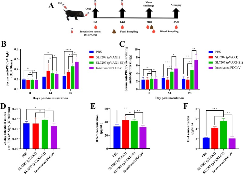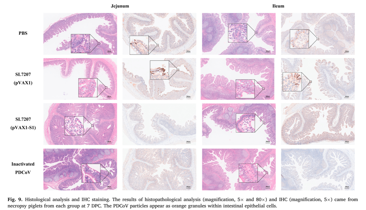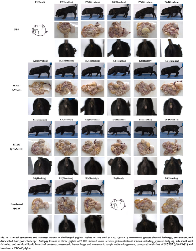 本研究首先通过基因重组技术构建了表达S1基因真核表达载体pVAX1-S1,再转化构建重组减毒沙门菌SL7207(pVAX1-S1),并通过WB、IFA、生长曲线评估、安全性评估等实验全面鉴定了SL7207(pVAX1-S1)的抗原递呈能力和生物学特性。随后,将SL7207(pVAX1-S1)口服小鼠和仔猪评估其口服免疫原性,结果证明口服SL7207(pVAX1-S1)可诱导小鼠和仔猪产生较强的体液免疫和细胞免疫。仔猪攻毒保护实验表明,与对照组相比,口服SL7207(pVAX1-S1)组和灭活苗组均可提供更好的临床保护效果,攻毒猪的腹泻症状、肠道病变和粪便排毒量等均比对照组更轻微。本研究为开发新型PDCoV等猪肠道病毒的口服疫苗提供了重要参考价值。