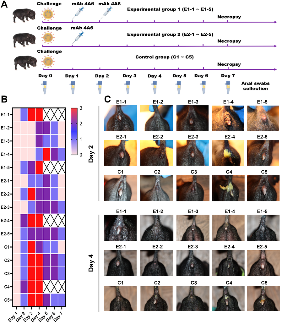 此外,本研究进一步评价了mAb4A6对PDCoV感染仔猪的效果。染哺乳仔猪我们在猪模型中评估了mAb4A6的治疗效果,结果表明,给予mAb 4A6治疗可以延迟感染仔猪发病,减轻腹泻的严重程度,减少粪便中排毒量,表明中和抗体mAb 4A6对PDCoV感染仔猪有明显临床疗效。