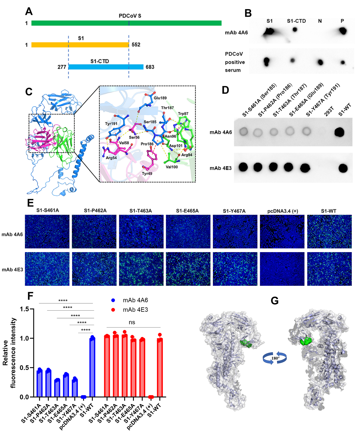 猪δ冠状病毒(PDCoV)是一种影响全球养猪业的肠道病原体,同时,PDCoV的跨种传播和潜在的公共安全风险也引起全球的共同关注。为预防和控制PDCoV,开发有效的抗病毒疗法至关重要,但迄今为止,针对PDCoV中和抗体疗效的研究尚少。团队制备了几十株针对PDCoV S蛋白的单克隆抗体(mAb)中,从中筛选出一株具有强中和PDCoV能力的单抗mAb 4A6,并通过噬菌体展示技术、分子对接及丙氨酸突变的方式,鉴定了中和性单抗mAb 4A6所识别的构象表位。