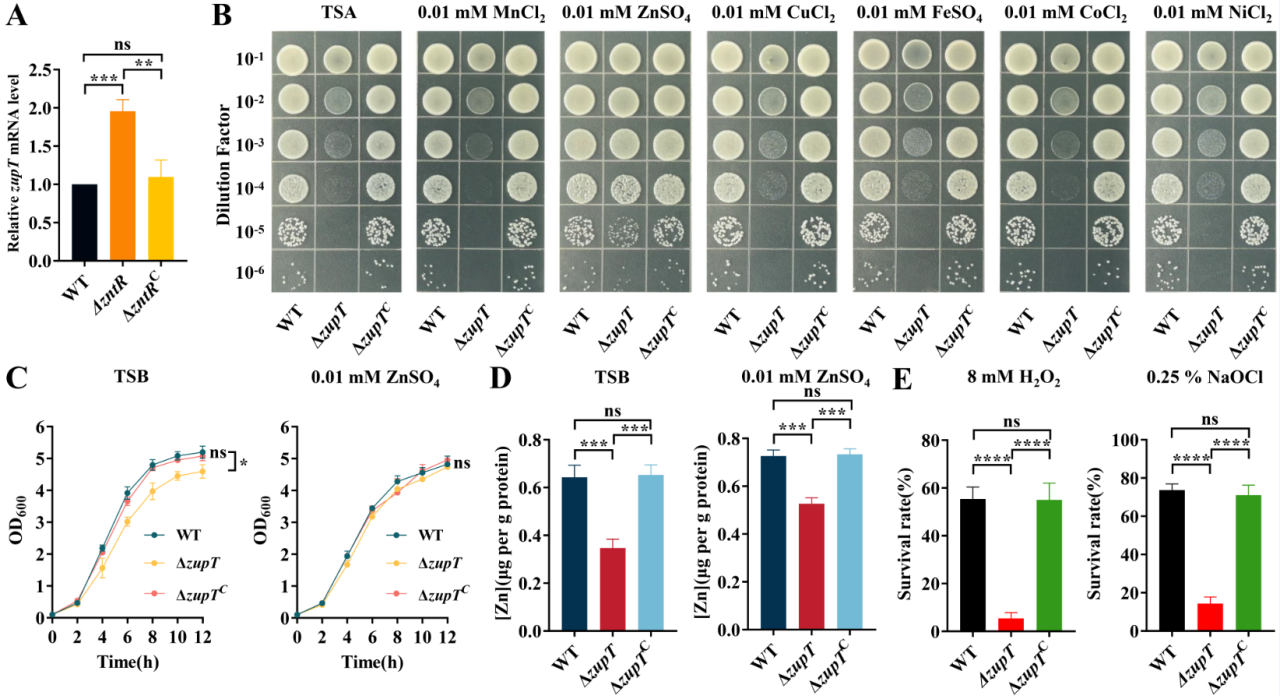 近日,动物医学免疫学研究所在美国微生物学会旗下期刊Microbiology Spectrum上发表题为“ZntR is a critical regulator for zinc homeostasis and involved in pathogenicity inRiemerella anatipestifer(鸭疫里氏杆菌ZntR是锌稳态的关键调控因子并参与致病)”的研究论文。该研究在鸭疫里氏杆菌中鉴定了一种参与维持锌离子稳态的关键调控因子ZntR,并通过转录组学和蛋白组测序发现了一系列参与锌离子转运和外排的基因,为进一步研究该菌锌离子稳态奠定基础。