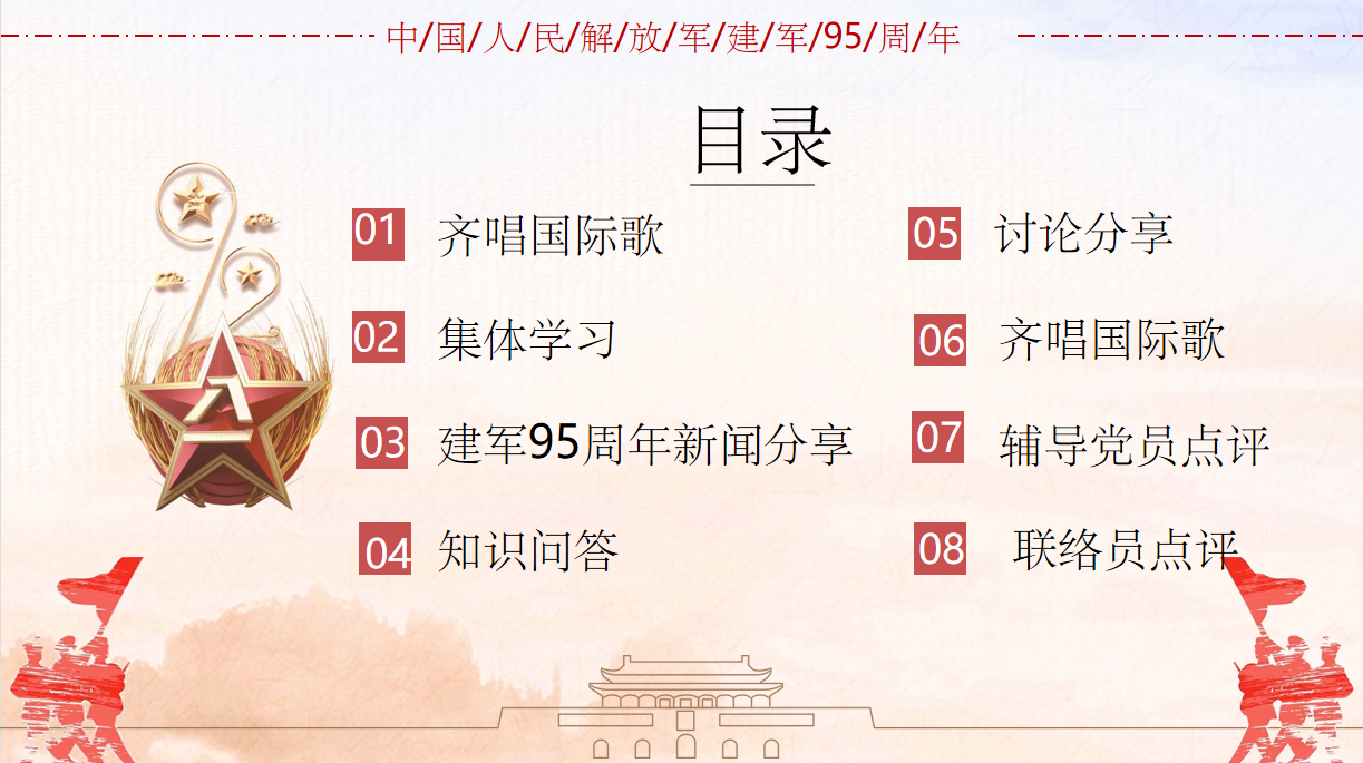 随着嘹亮的《国际歌》响起,本次理论学习拉开了序幕。紧接着,由主持人孟德超带领分队成员进入到了集体学习板块,介绍了建军节的诞生、中国人民解放军建军历史、建军精神以及国防建设,同时观看了庆祝建军95周年视频,使得分队成员对于建军这一段历史有了更深的理解。