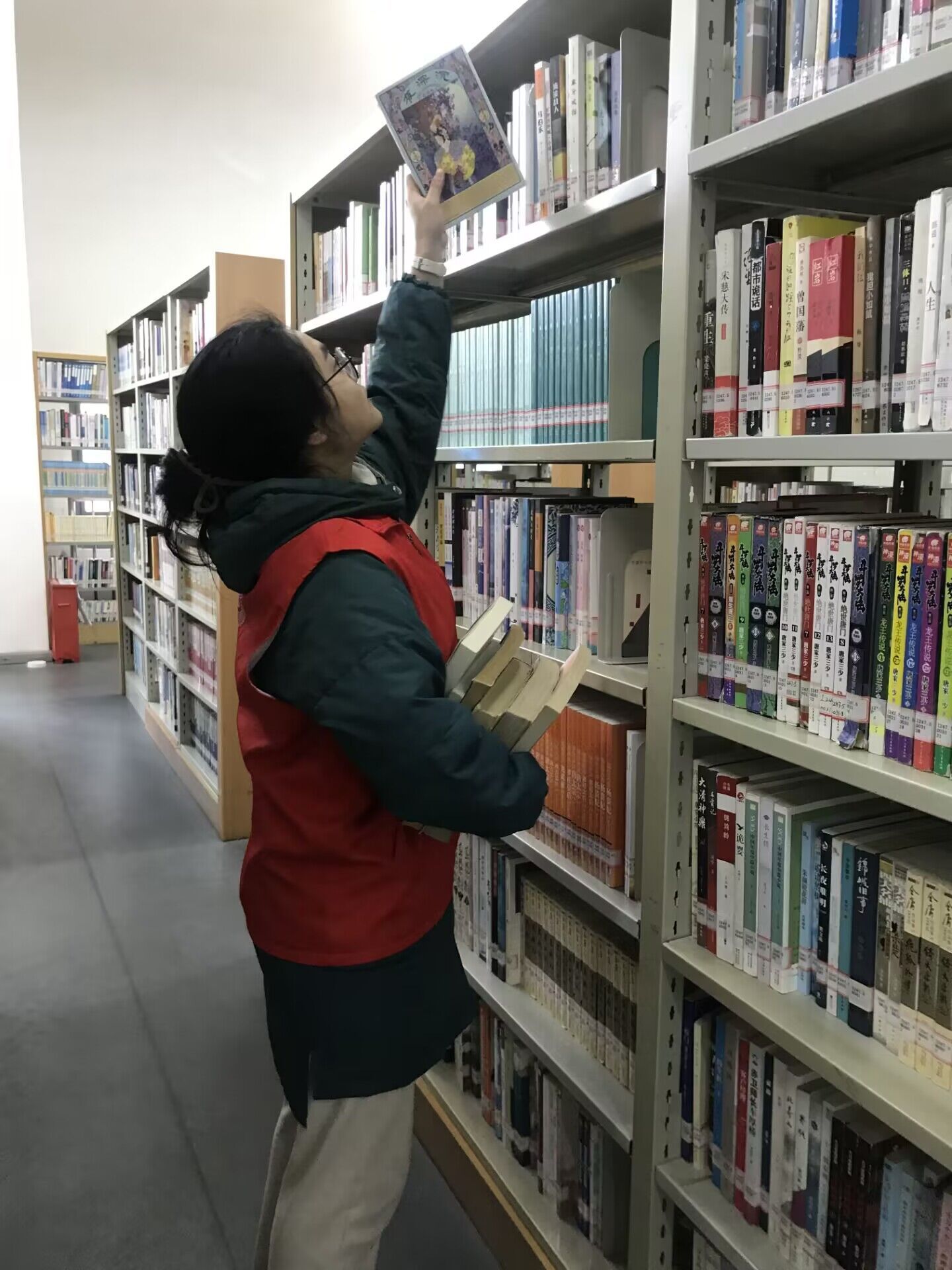 于图书馆内浸润书香气,从书中汲取红色文化丰富养料。李珺贤同学从零开始,摸索图书馆结构、明确书籍编号含义、找清书籍的位置,不断学习自己的志愿服务内容,并探寻图书馆中的红色文化传播态势。