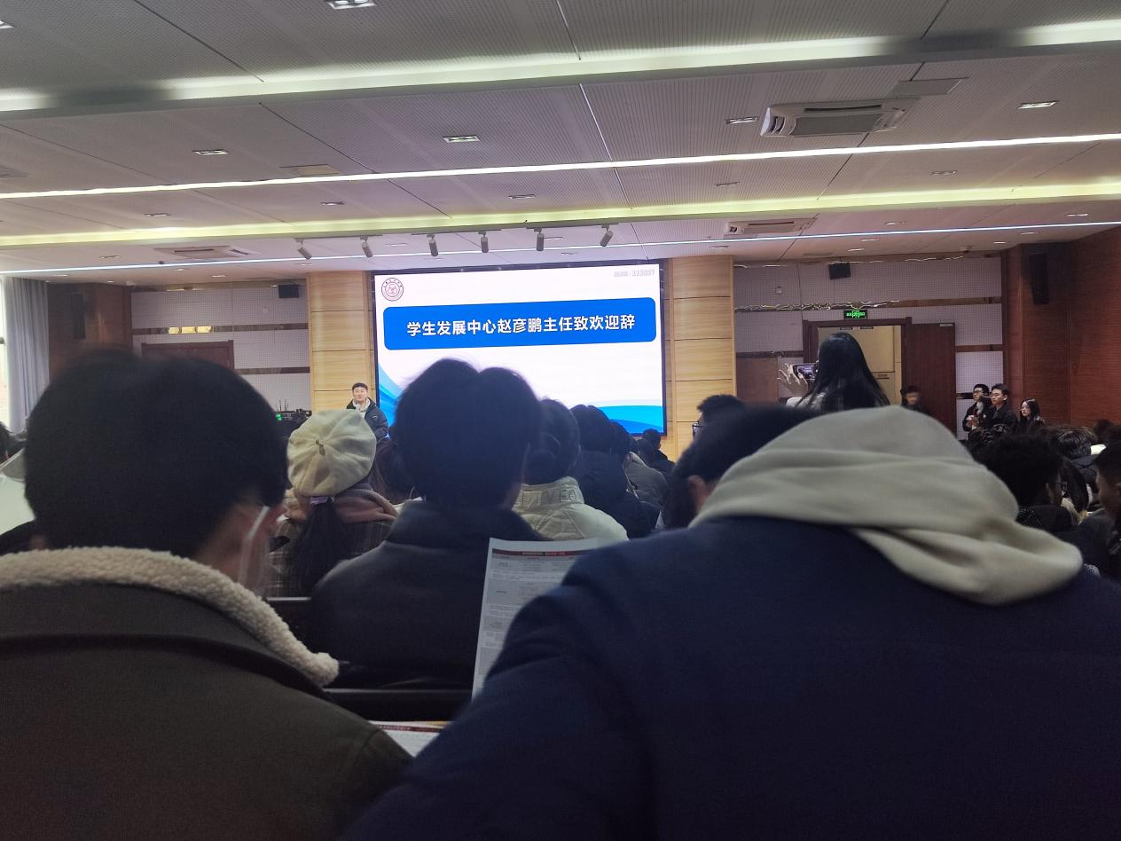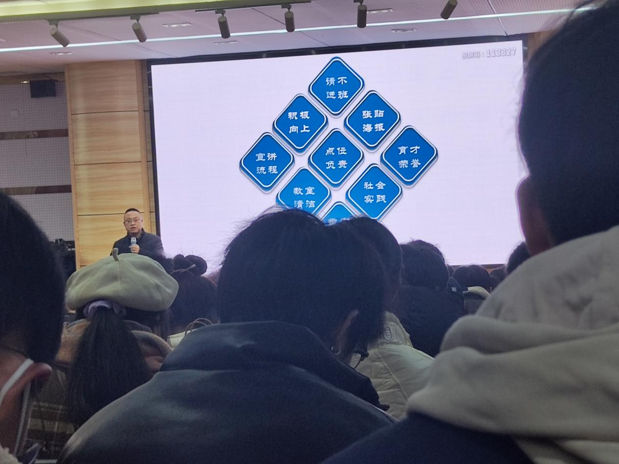 随后,重庆市育才中学教务中心主任王鸿江讲述本次宣讲的具体安排。首先,王鸿江对所有返校宣讲的大学生表示欢迎。随后,他强调了宣讲活动中的一些注意事项,包括宣讲教室、宣讲时间、海报张贴等内容,以便活动高效有序进行。最后,王鸿江预祝本次活动圆满进行。