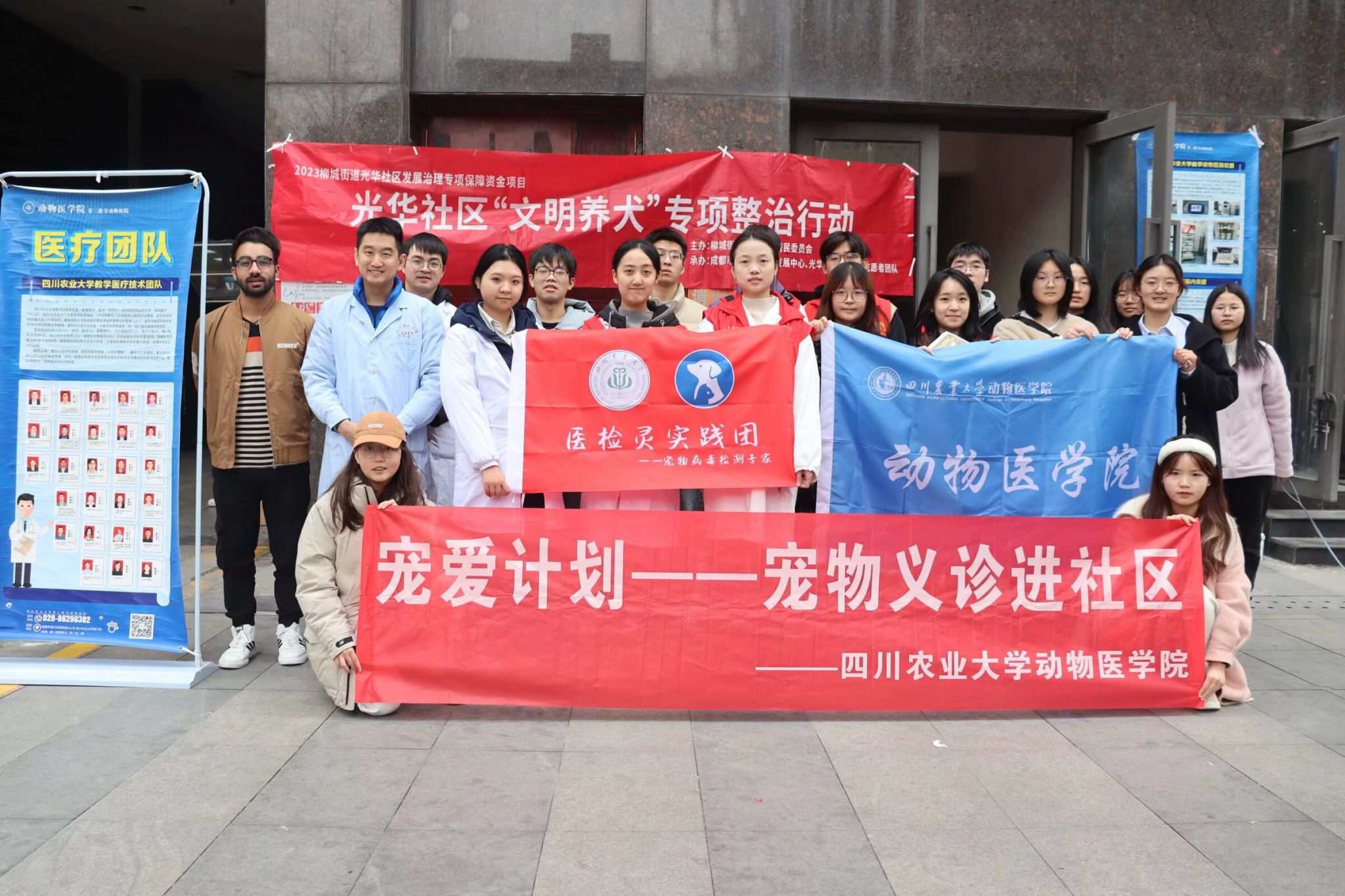 线上实践期间,团队成员与第二分队联合宣传,转发团队官方账号“宠爱计划”在小红书、抖音、快手等各大网络平台上发布的有关科学养宠的科普视频和文章,并撰写新闻报道。通过持续的宣传活动,提高了社会民众对正确养宠的认知,同时团队成员们也在过程中积累了更多的专业知识,拓展了专业深度,为日后的学习打下了基础。除线上实践,团队还积极联系学校周边社区,于2月19日在成都市温江区光华社区,联合best365网页版登录官方网站实志中心举行了线下宠物义诊活动。活动邀请了best365网页版登录官方网站教学动物医院的周紫峣医生以及研究生师兄师姐组成的专业义诊团队,为宠物提供常规体检和专业诊疗建议。团队成员为社区民众发放科普宣传手册,讲解科学养宠知识,并于现场观摩学习宠物诊疗理论和宠物体检基础手法,可谓收获满满。