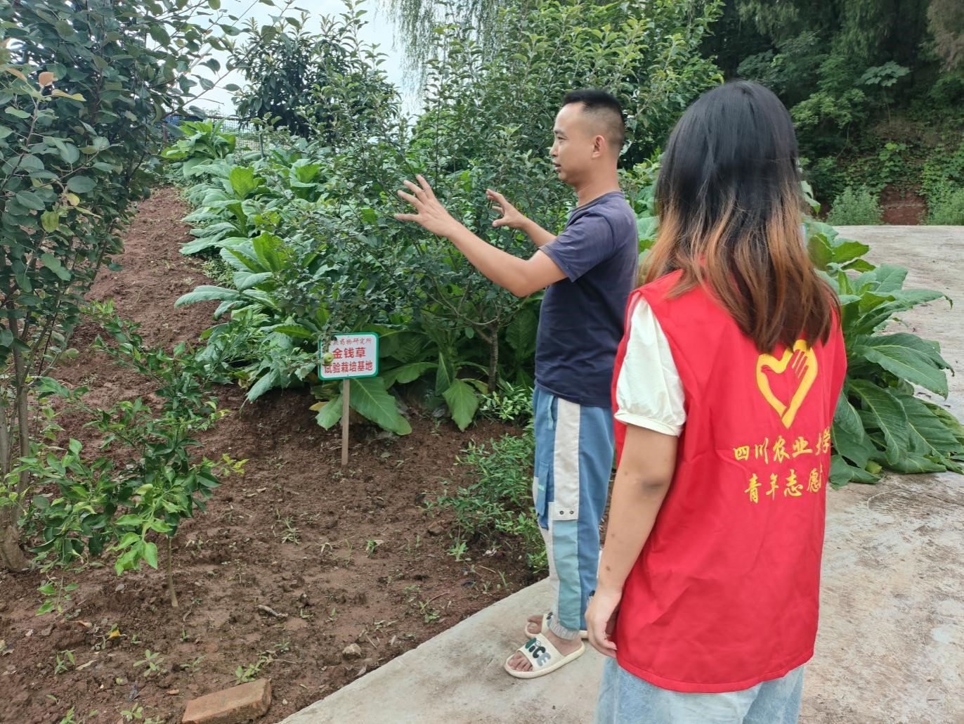(图为基地负责人向队员介绍作物发展情况)