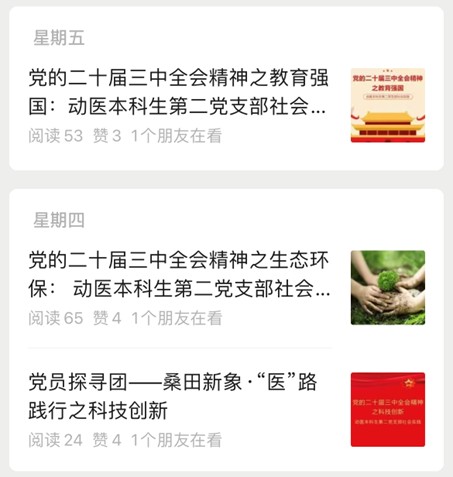 在内容创作方面,医新印象三分队与动医本科生团队携手合作,共同推出了党的二十届三中全会精神系列推文。这些推文不仅深入解读了会议精神,还紧密结合学院实际情况,引导师生深入学习领会党的最新政策,为学院的党建工作注入了新的活力。此外,团队还精心策划并发布了“医家泰斗”系列推文,通过介绍学院杰出校友和优秀研究者的先进事迹,充分展示了学院在医学领域的深厚底蕴和卓越成就。