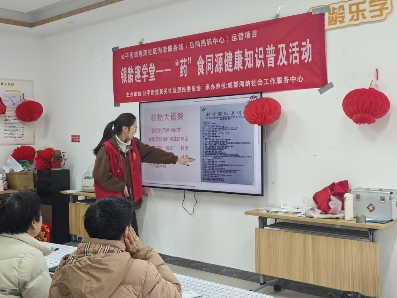 活动第二板块围绕用药安全展开。任姝奕首先为老人们解读药品说明书中的各类专业术语,帮助老人们跨越阅读障碍,让晦涩难懂的说明书变得通俗易懂。紧接着,任姝奕针对药品生产日期的不同标注方式进行详细说明,帮助老人们清晰辨别药品有效期,同时深入分析盲目储备、包装过大、处方超量等导致过期药品产生的常见原因,引导老人树立正确的用药储备观念。最后,本次活动开展“药物大侦探”小游戏,通过模拟用药场景,提醒老人们用药前务必仔细阅读说明书,时刻把用药安全放在首位,为健康负责。