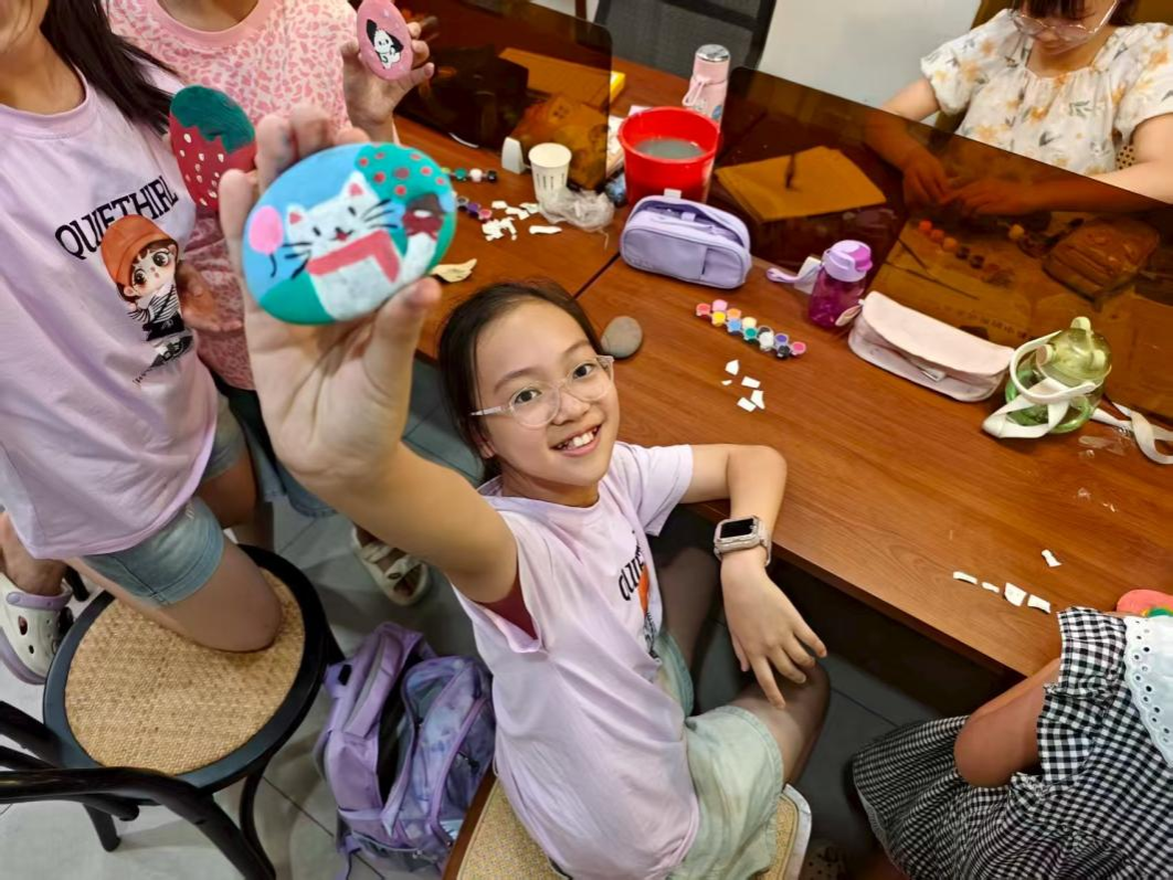 7月28日,石头画课程为夏令营画上精彩句点。在绘制过程中,孩子们用丙烯颜料在石头上勾勒图案,穿插20分钟休息让创作节奏张弛有度。激发灵感的创意互动小游戏,,一块块普通石头变身艺术小品,即见证孩子们创意与动手能力的提升,也为夏令营手工系列活动,写下生动注脚。