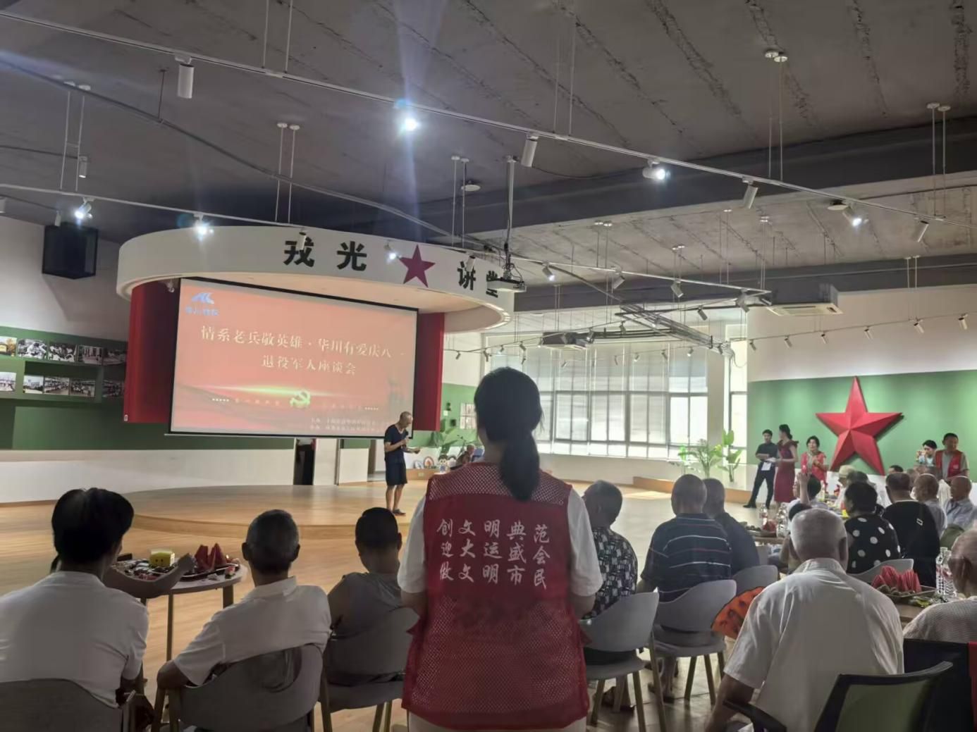 退伍军人座谈会服务现场,“志愿红”实践团以饱满热情投入工作。活动筹备时,志愿者们精心布置场地,调试设备、整理老兵事迹资料。座谈会上,负责接待引导老兵的志愿者,搀扶老兵入座、递上热茶;承担会议记录的成员,飞速记录老兵讲述的军旅故事——从戍边的风雪坚守,到救灾的生死逆行,那些热血与担当,深深震撼着志愿者的心灵。