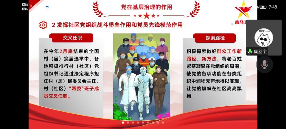 此外,支部邀请了青马班学员庞丝宇为支部成员讲解了关于基层治理的相关内容,基层治理是国家治理的基石,统筹推进乡镇(街道)和城乡社区治理,是实现国家治理体系和治理能力现代化的基础工程。新时代中国青年是基层社会治理中最有生机、最具创新力的主体,广大青年的充分参与发挥了不可或缺的重要作用。在喜迎二十大之际,新时代青年应以青春之热、青春之干劲,肩负起国家和民族的希望,以奋进的姿态迎接二十大的召开!