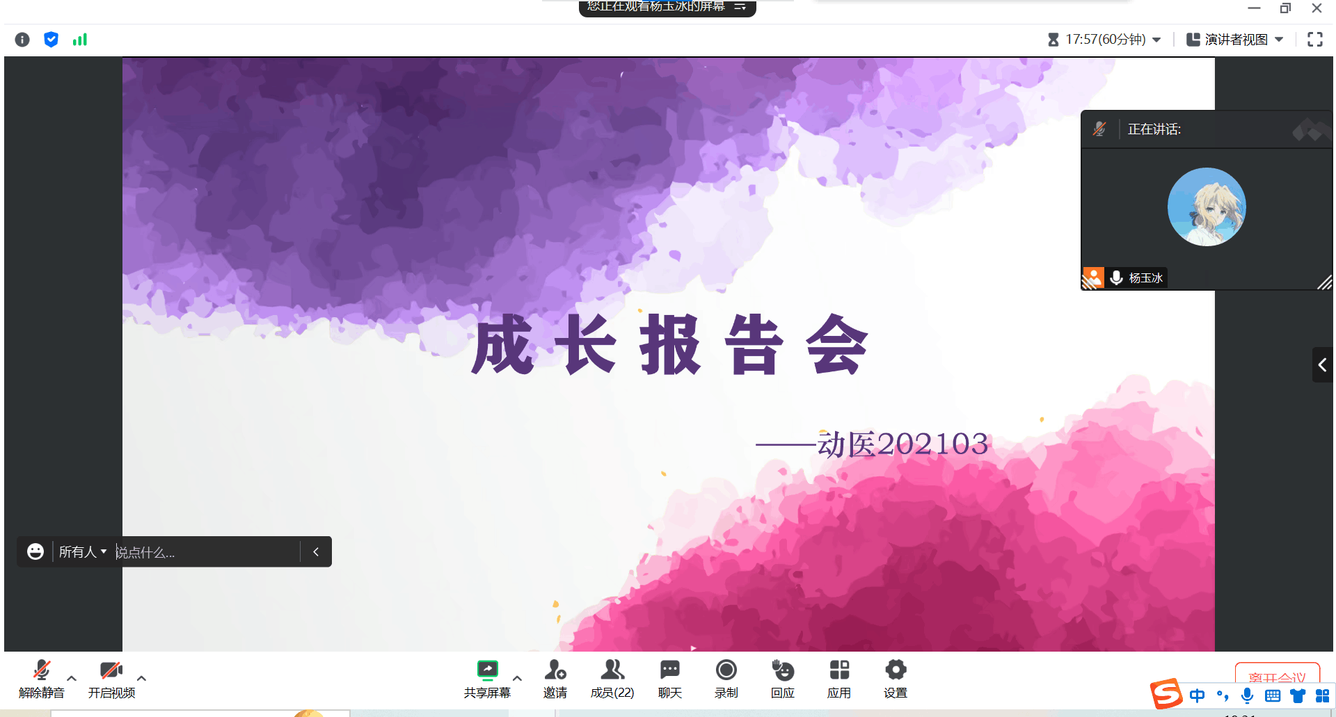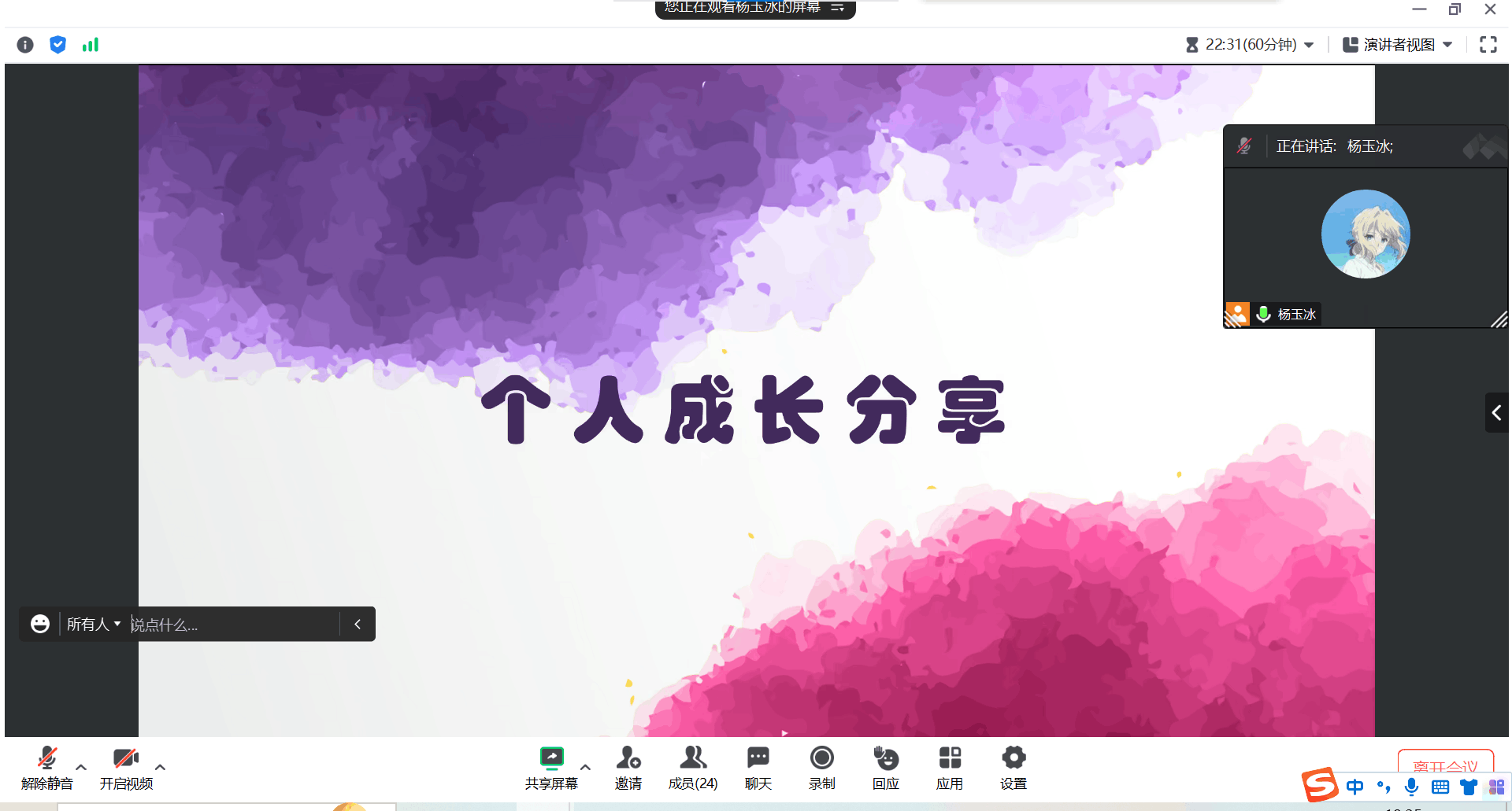 随后,班级同学代表刘恒、项汪杰、谢雨含、胡古月、冯茹楠依次进行了个人成长总结分享。刘恒讲道:“在过去两年的大学生活中,我经历了许多成长与变化。在大二一年里,面对各类课程与任务,我逐渐养成了高效学习的习惯,不断提升自己的时间管理能力与组织能力。除了学业,我在团队合作和人际交往方面也有了明显的成长,学会了在团队中分工合作,取得共同的成功。大三的门槛即将到来,我更加坚定了自己的信心,我会继续努力,争取在未来的学习中有更多的突破与进步。”冯茹楠则道:“两年的时间,虽然说短暂,但是对于一个人的成长来说却是非常重要的。我逐渐学会了理性思考。不再仅仅通过感性理解去解决问题。这种能力的提高,也让我在生活中遇到问题时,能够更加深入的分析、解决。”五名代表情感真挚的分享也令其余同学十分动容,班级同学纷纷在线上分享了自己的成长感悟。