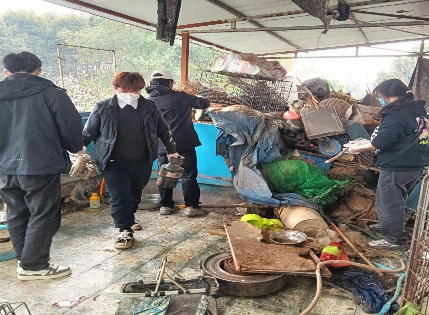 3月8日下午,动医202204团支部成员分成四个小组前往启明动保中心。到达后,三个小组负责在基地周边清除杂草、捡拾垃圾,另一组在工作人员的指导下为启明动保收容的近三千只流浪犬猫准备食物。除草工作结束后,四个小组进入基地内部,协助彭女士分类整理物资,处理过期或多余的用品及废弃生锈的铁制品。经过数小时的努力,志愿者们合力清理出一大片可用空间。