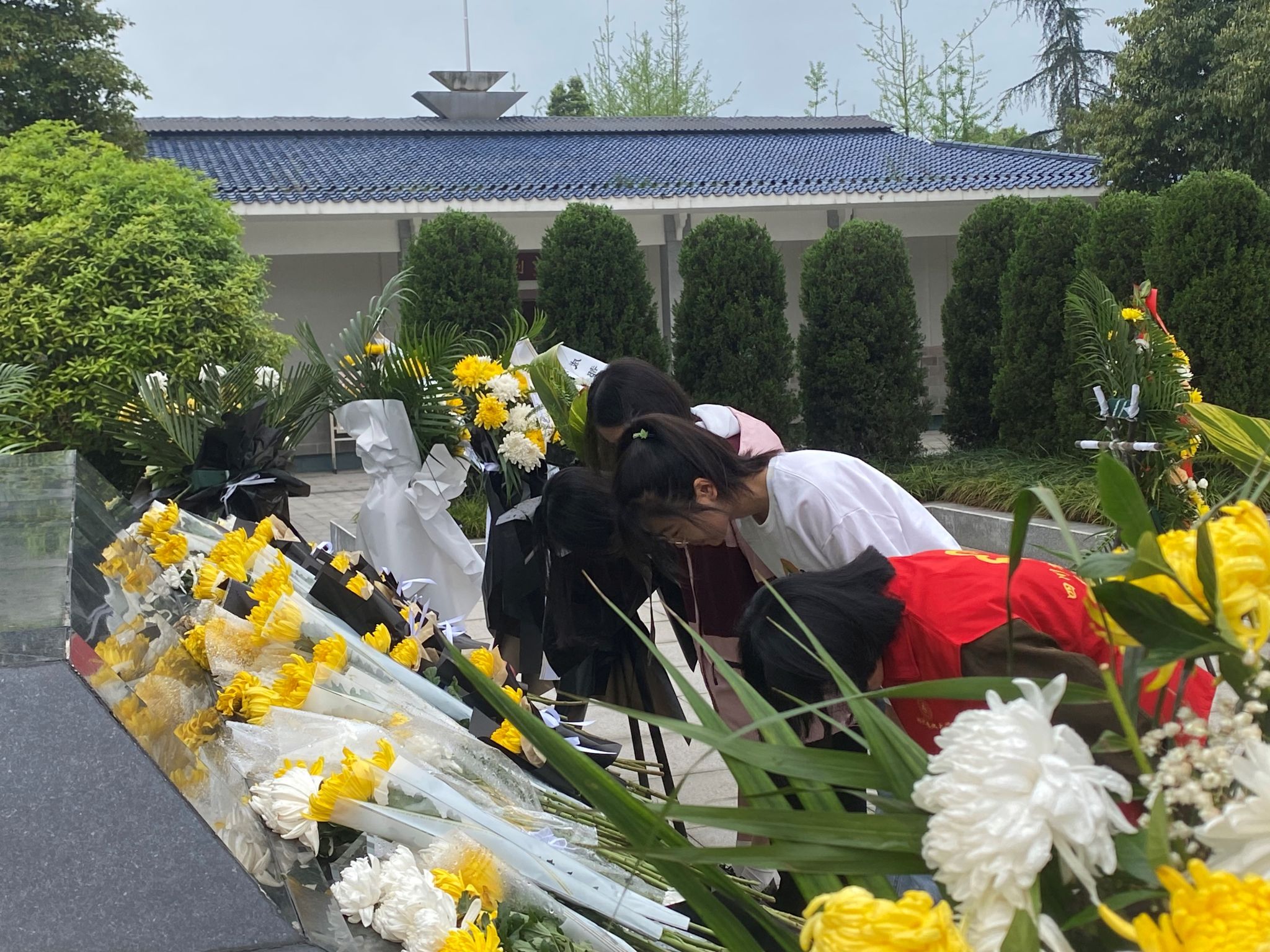 队伍集结完毕后,38名药学二班学子怀着沉重的心情和崇高的敬意走进温江烈士陵园,在温江革命烈士纪念碑下默哀1分钟。默哀结束后,成员分为三人一组献花、鞠躬。