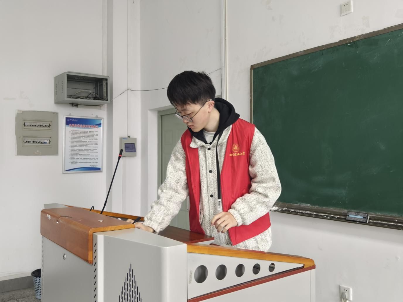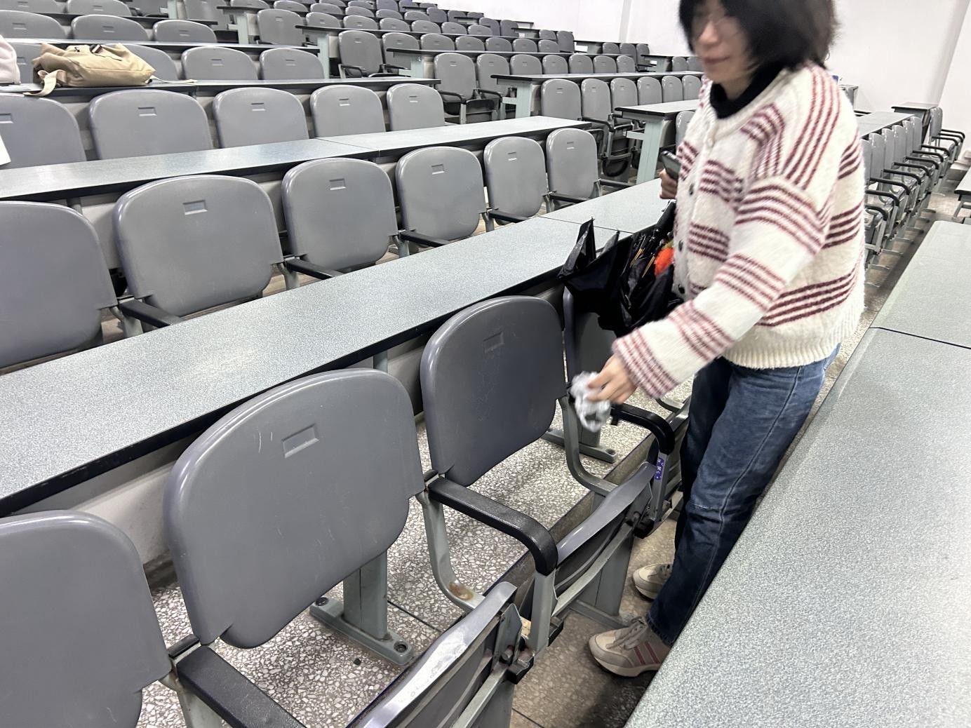 活动开始,小班志愿者们分别手持扫帚、抹布、垃圾袋等工具在四教A区教学楼前整齐列队,活动负责人杨韬将小班男女生分为教室清洁组、楼道攻坚组、垃圾分类组三个小队展开行动。活动过程中,女生志愿者们在四教A区一楼教室擦拭窗台积灰,清理黑板和讲台,捡起桌椅夹缝中的纸屑。楼道攻坚组的志愿者们则使用扫帚清扫楼道。在楼梯转角卫生等卫生死角,志愿者们发扬"螺丝钉精神",蹲下进行深度清洁。与此同时,男生志愿者们则在四教A区二楼教室进行相同的卫生打扫工作。此外,志愿者们还自发组成"垃圾清零小分队",将散落在教室周边的塑料瓶、废纸巾等分类投放到指定回收点。
