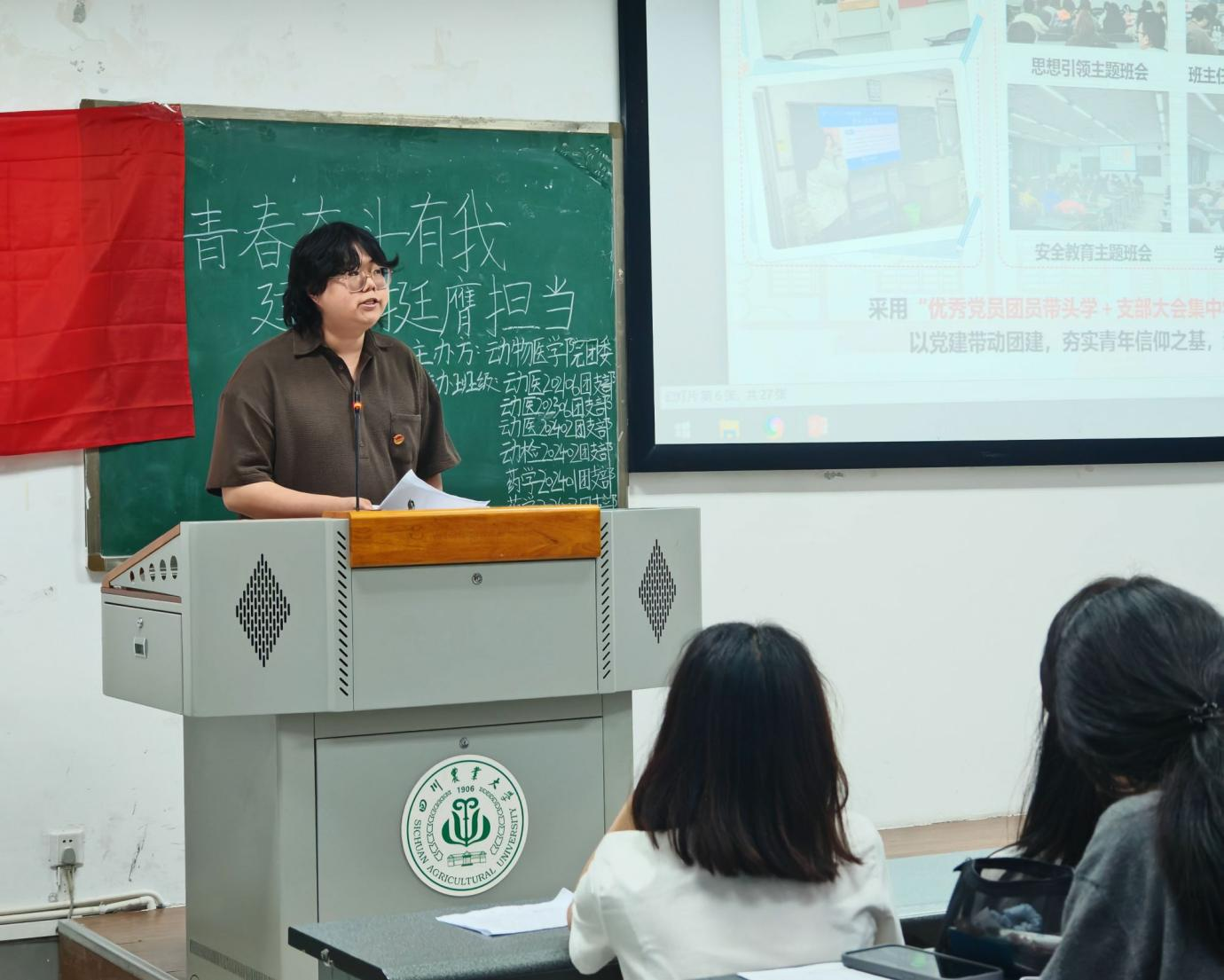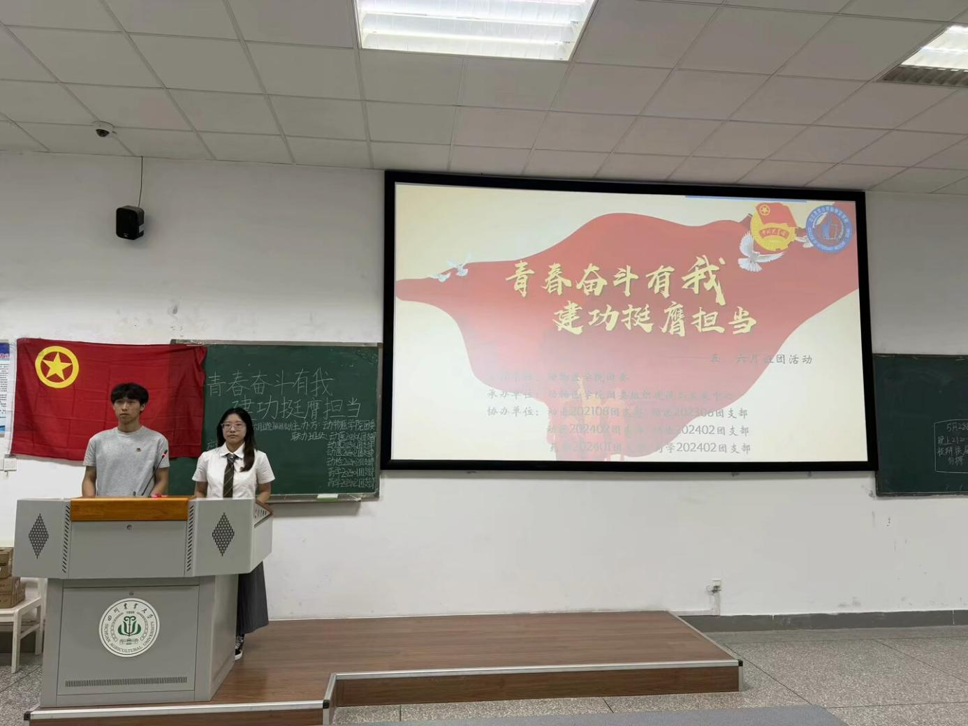 活动开始,全体成员面向团旗齐唱团歌。随后,两位主持人带领参会成员们进入了第一章——“承五四薪火,悟回信精神”的学习。首先,来自青马班的甘雨薰向青年们分享了她对习近平总书记回信精神的思考与感悟,随后播放了由校团委原创的五四快闪视频——《百年传薪火,川农正青春》,号召广大青年在实践中践行五四精神;而最后,五四红旗标兵团支部——药学202202团支部则分享了他们的宝贵经验,指引青年团员们不断追求卓越。
