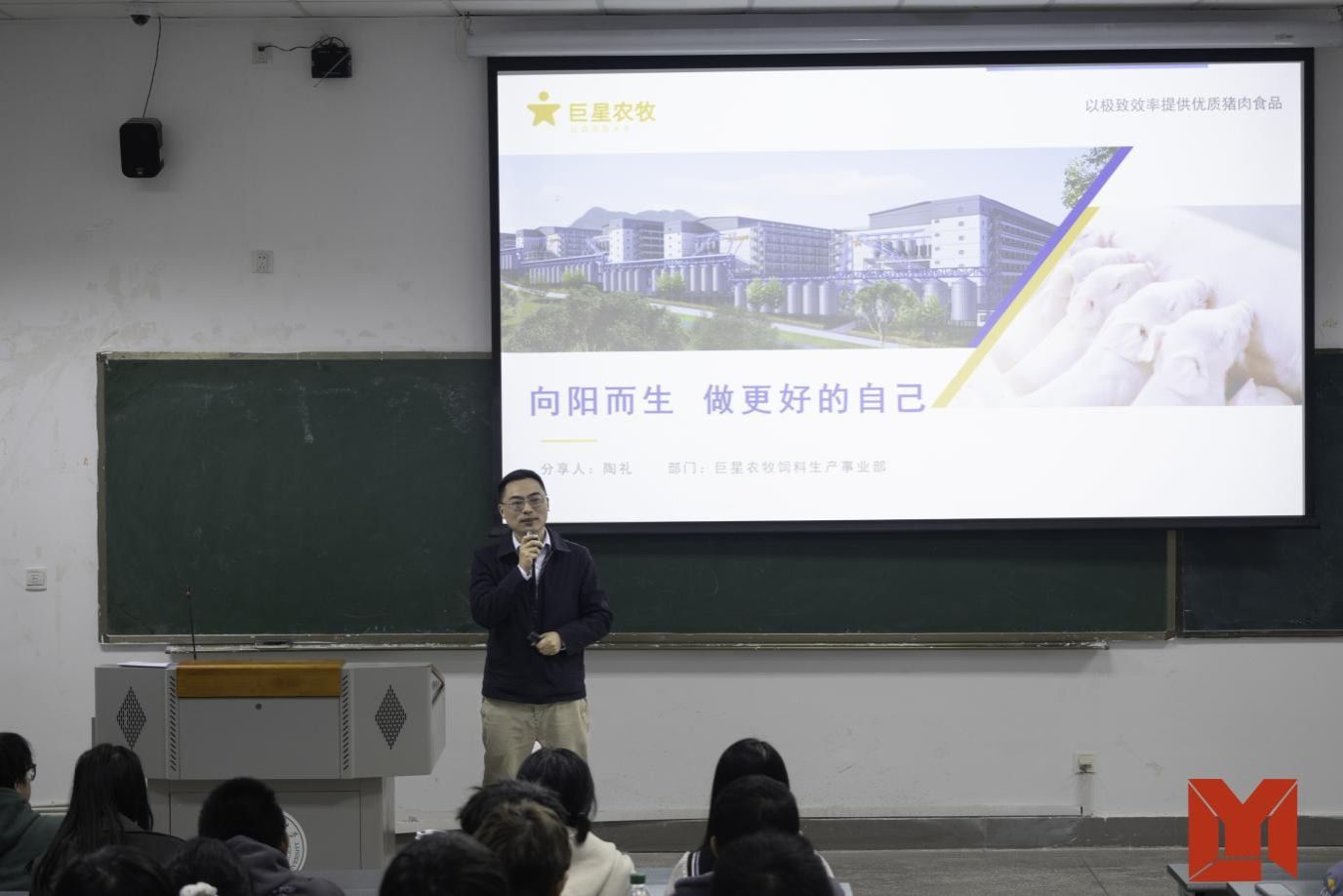 刘泓晖以“巨星农牧的昨天、今天与明天”为主题,通过详实的数据展示了企业从1994年创立至今的发展历程。特别是2005年转型社会养殖后,企业通过“技术+管理”双轮驱动,实现了年收入60亿元、利润5.18亿元的亮眼业绩。在分享中,刘泓晖重点解析了巨星农牧集团别具一格的“保姆式”人才培养体系,通过对比行业通用模式,让学子们直观感受到巨星农牧在人才培育方面的差异化优势。