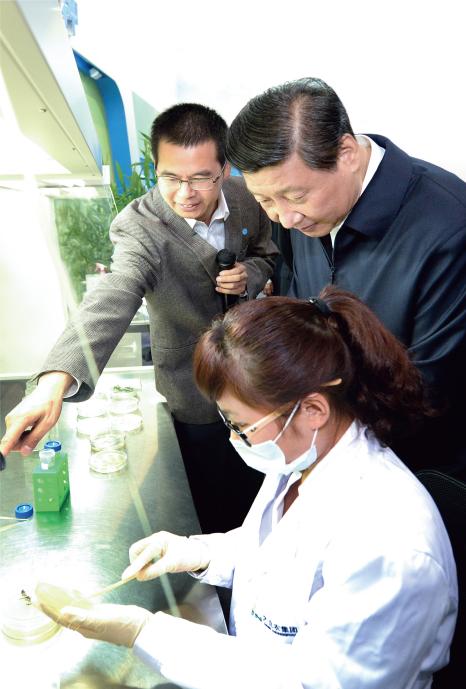 (2013年9月,习近平总书记率中央政治局全体委员到中关村集体学习,视察大北农最新生物育种成果。大北农集团董事长邵根伙博士向习近平总书记汇报农业生物技术的前沿发展和大北农最新科技创新成果。)