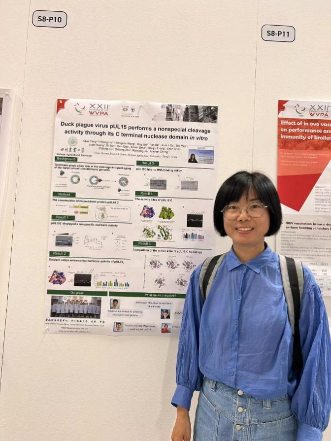 杨乔博士的研究主要围绕家禽病毒病展开,特别是对鸭瘟病毒(DPV)的研究取得了显著成果。此次会议上,她展示了DPV pUL15在家禽体内的生物学特性及其在病毒复制和致病过程中的作用。这一研究对于深入理解鸭瘟病毒的感染机制和防控策略具有重要意义,也为其他家禽病毒病的防控提供了新的思路和方法。