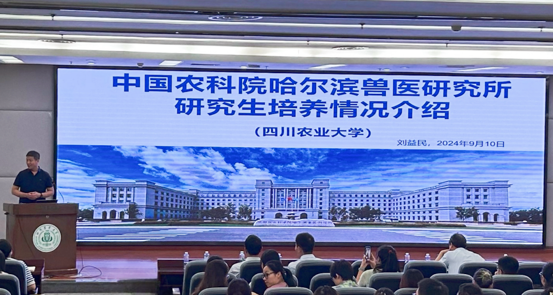 最后,刘益民院长以“哈尔滨兽医研究所研究生培养情况介绍”为主题,全面展示了哈尔滨兽医研究所的深厚底蕴与蓬勃生机。他详细介绍了研究所的基础设施、学习环境、师资力量以及学生就业情况,使同学们对哈尔滨兽医研究所有了更加全面而深入的了解。